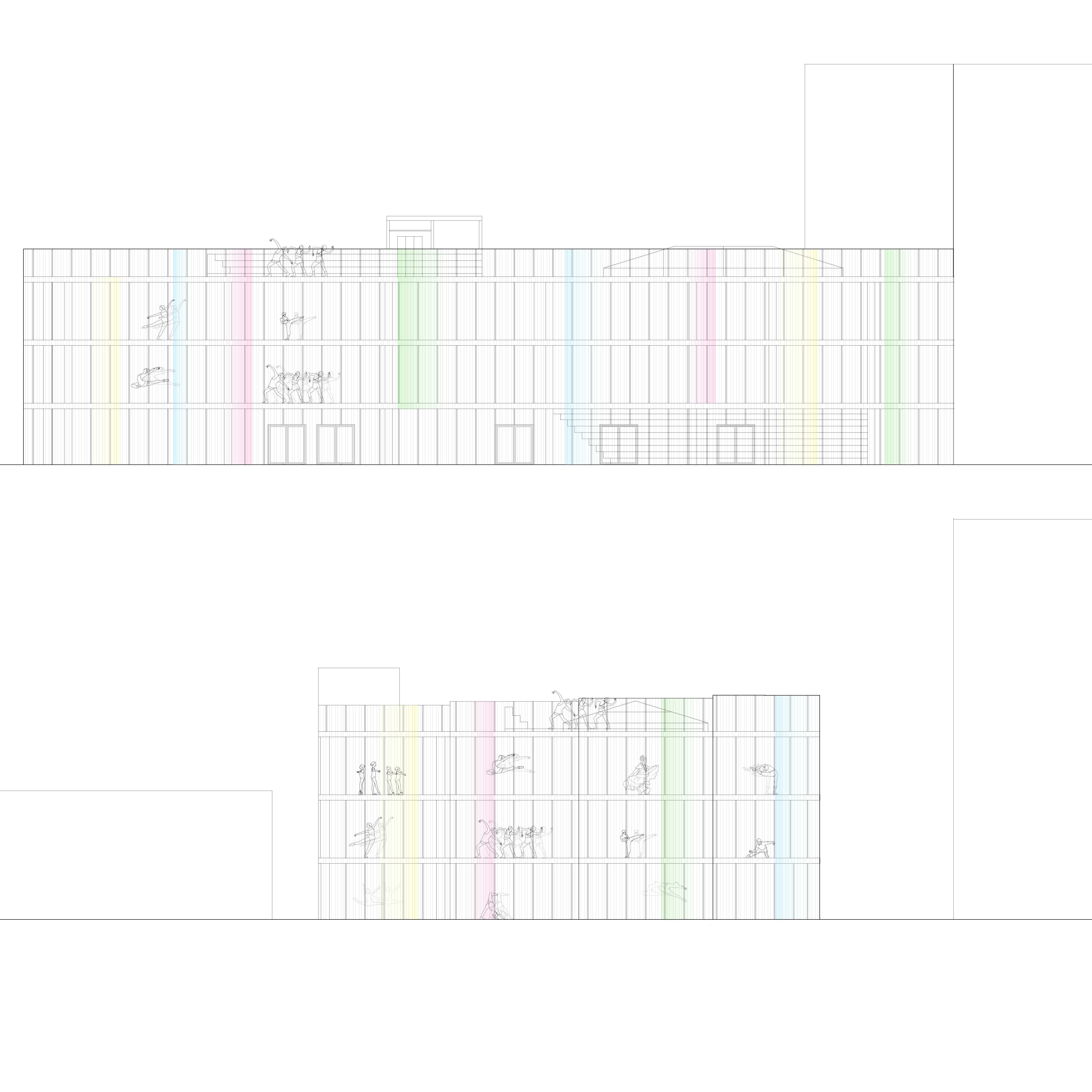 The building’s two halves support continuous activity: studios and training spaces operate nearly 24 hours for diverse users, while the performance side activates during scheduled events, workshops, and community gatherings.