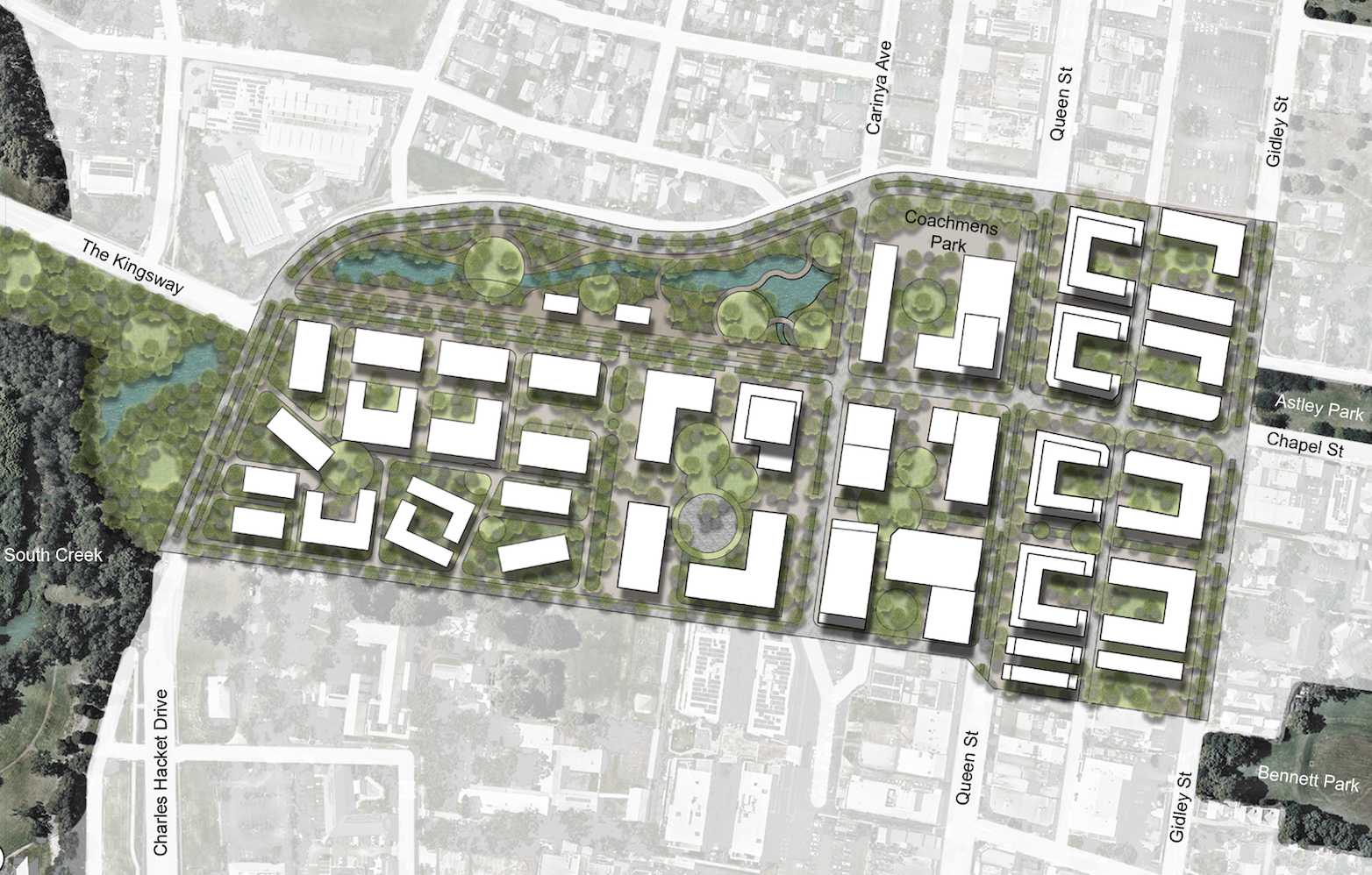 3D Model of the South Park Precinct, highlighting the extensive parklands and how the proposed built form fits into the surrounding neighbourhood of St Marys.