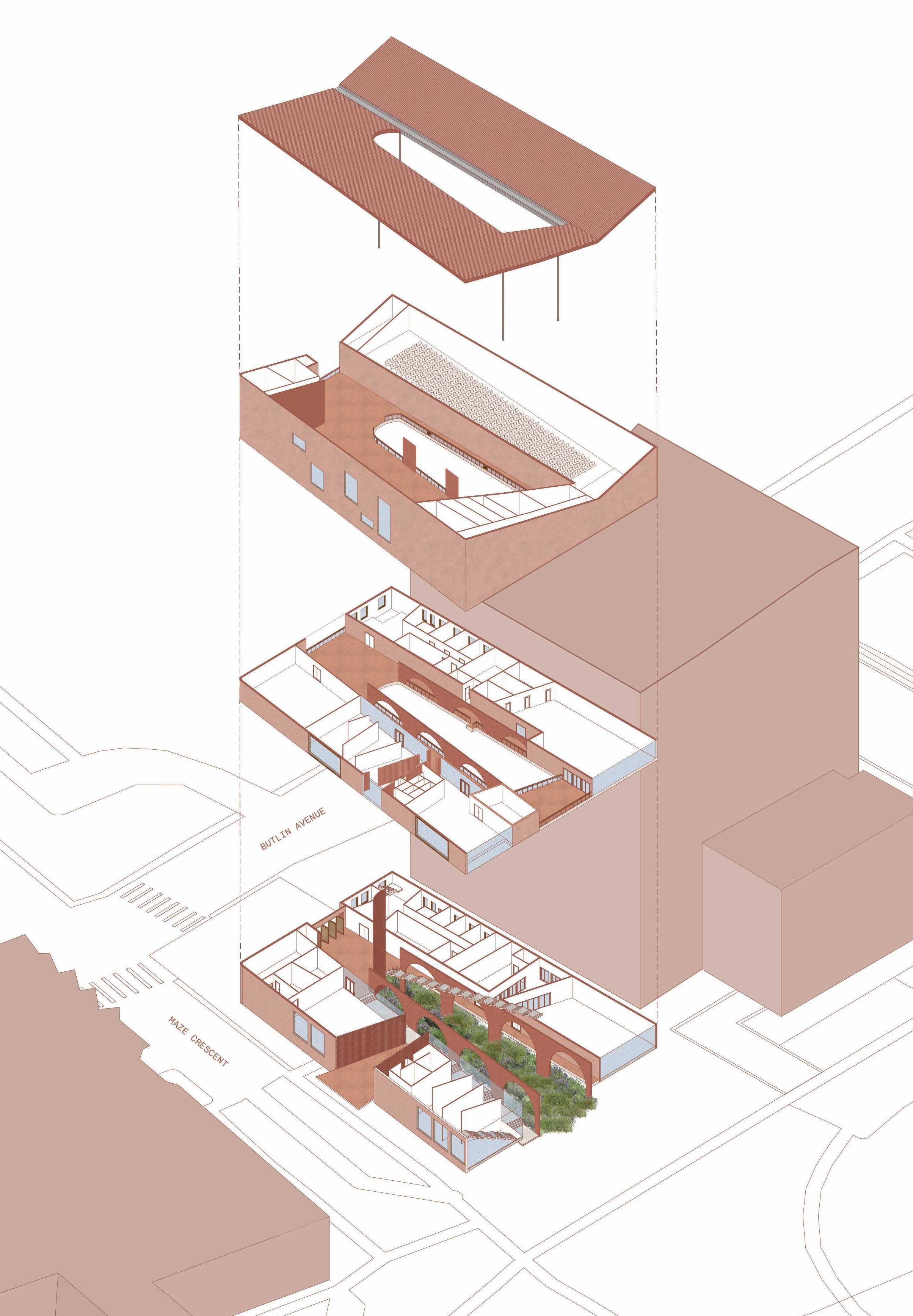 Groundline is conceived as an architecture of confluence, where water, land, and community interweave through a continuous spatial and ecological armature. Informed by the accumulated histories embedded within the site, the project advances essential interventions, allowing the ground’s inherent rhythms to remain legible. A bioswale operates as an organising spine, treating water as a shaping intelligence and a cultural thread that unifies movement, program, and landscape. By amplifying the site’s existing logics, the design cultivates conditions for learning, gathering, and reflection. Groundline proposes an adaptive, open-ended, and receptive framework, through which Country’s presence can be sensed, engaged, and continually reinterpreted.